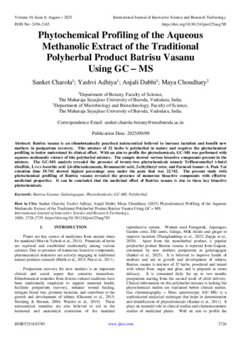 Charola, Sanket and Adhiya, Yashvi and Dabhi, Anjali and Choudhary, Maya (2025) Phytochemical Profiling of the Aqueous Methanolic Extract of the Traditional Polyherbal Product Batrisu Vasanu Using GC – MS. International Journal of Innovative Science and Research Technology, 10 (8): 25aug785. pp. 2726-2729. ISSN 2456-2165