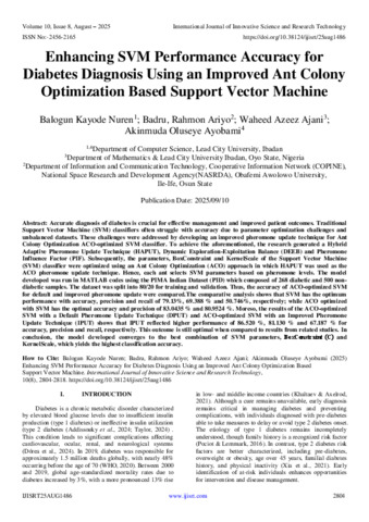 Kayode Nuren, Balogun and Rahmon Ariyo, Badru, and Azeez Ajani, Waheed and Oluseye Ayobami, Akinmuda (2025) Enhancing SVM Performance Accuracy for Diabetes Diagnosis Using an Improved Ant Colony Optimization Based Support Vector Machine. International Journal of Innovative Science and Research Technology, 10 (8): 25aug1486. pp. 2804-2818. ISSN 2456-2165