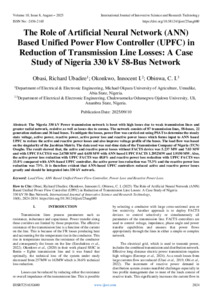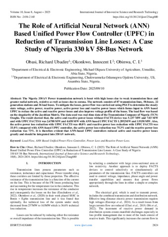 Ubadire, Obasi, Richard and Innocent I., Okonkwo, and C. I., Obinwa, (2025) The Role of Artificial Neural Network (ANN) Based Unified Power Flow Controller (UPFC) in Reduction of Transmission Line Losses: A Case Study of Nigeria 330 kV 58-Bus Network. International Journal of Innovative Science and Research Technology, 10 (8): 25aug680. pp. 2824-2834. ISSN 2456-2165