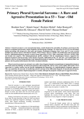 Sara, Ibrahimi and Sanae, Kdadri and Mehdi, Ibrahimi and Boutayeb, Saber and Ghissassi, Ibrahim EL and Rabti, Hind M’ and Errihani, Hassan (2025) Primary Pleural Synovial Sarcoma : A Rare and Agressive Presentation in a 53 – Year - Old Female Patient. International Journal of Innovative Science and Research Technology, 10 (9): 25sep066. pp. 18-20. ISSN 2456-2165