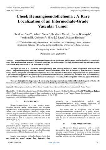 Sara, Ibrahimi and Sanae, Kdadri and Mehdi, Ibrahimi and Boutayeb, Saber and Ghissassi, Ibrahim EL and Rabti, Hind M’ and Errihani, Hassan (2025) Cheek Hemangioendothelioma : A Rare Localization of an Intermediate-Grade Vascular Tumor. International Journal of Innovative Science and Research Technology, 10 (9): 25sep068. pp. 21-23. ISSN 2456-2165