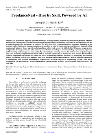 N G, Anoop and K P, Preethi (2025) FreelanceNest - Hire by Skill, Powered by AI. International Journal of Innovative Science and Research Technology, 10 (9): 5sep039. pp. 47-52. ISSN 2456-2165