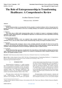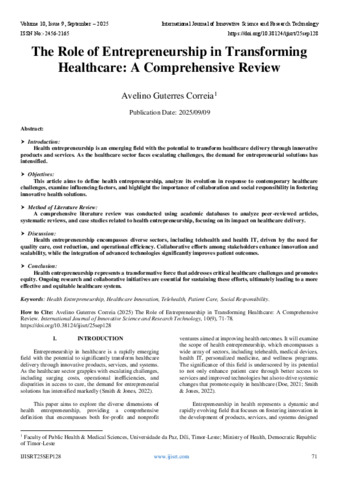 Guterres Correia, Avelino (2025) The Role of Entrepreneurship in Transforming Healthcare: A Comprehensive Review. International Journal of Innovative Science and Research Technology, 10 (9): 25sep128. pp. 71-78. ISSN 2456-2165
