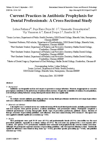 Fathima, Lubna and Priya M. S., Puja Harie and Deenadayalan, Vasumathi and A., Viji Vinnarasi and S., Kamal Deepa and M. R., Ramba (2025) Current Practices in Antibiotic Prophylaxis for Dental Professionals: A Cross-Sectional Study. International Journal of Innovative Science and Research Technology, 10 (9): 25sep079. pp. 83-89. ISSN 2456-2165