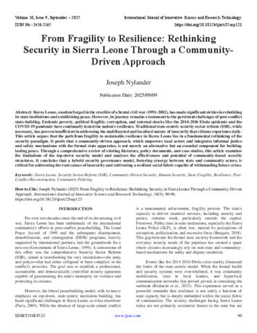 Nylander, Joseph (2025) From Fragility to Resilience: Rethinking Security in Sierra Leone Through a Community- Driven Approach. International Journal of Innovative Science and Research Technology, 10 (9): 25sep123. pp. 90-96. ISSN 2456-2165