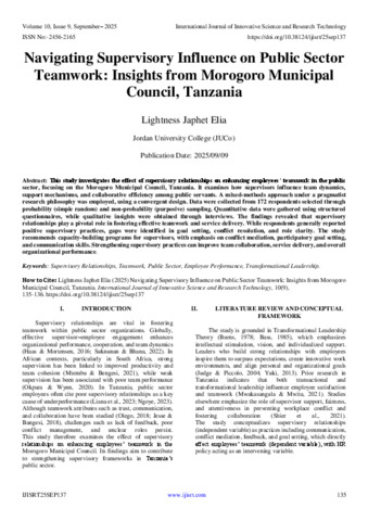 Japhet Elia, Lightness (2025) Navigating Supervisory Influence on Public Sector Teamwork: Insights from Morogoro Municipal Council, Tanzania. International Journal of Innovative Science and Research Technology, 10 (9): 25sep137. pp. 135-136. ISSN 2456-2165