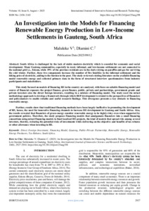 V, Maluleke and C., Dlamini (2025) An Investigation into the Models for Financing Renewable Energy Production in Low-Income Settlements in Gauteng, South Africa. International Journal of Innovative Science and Research Technology, 10 (8): 25aug358. pp. 2927-2944. ISSN 2456-2165