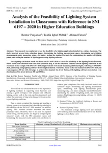 Panjaitan, Bontor and Miftak, Taufik Iqbal and Fatoni, Ahmad (2025) Analysis of the Feasibility of Lighting System Installation in Classrooms with Reference to SNI 6197 – 2020 in Higher Education Buildings. International Journal of Innovative Science and Research Technology, 10 (8): 25aug1554. pp. 2945-2953. ISSN 2456-2165