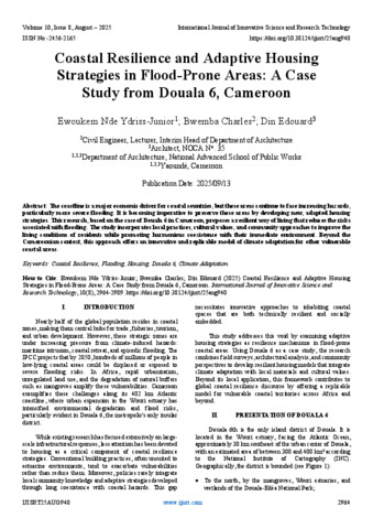 Ydriss-Junior, Ewoukem Nde and Charles, Bwemba and Edouard, Din (2025) Coastal Resilience and Adaptive Housing Strategies in Flood-Prone Areas: A Case Study from Douala 6, Cameroon. International Journal of Innovative Science and Research Technology, 10 (8): 25aug940. pp. 2964-2989. ISSN 2456-2165