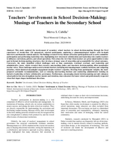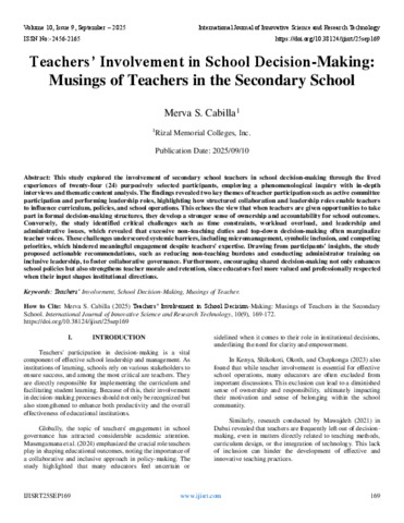 Cabilla, Merva S. (2025) Teachers’ Involvement in School Decision-Making: Musings of Teachers in the Secondary School. International Journal of Innovative Science and Research Technology, 10 (9): 25sep169. pp. 169-172. ISSN 2456-2165