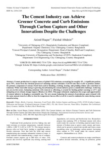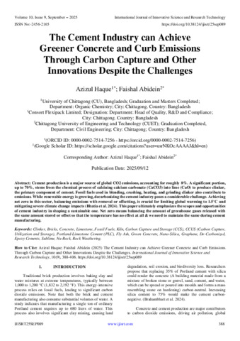 Haque, Azizul and Abidein, Faishal (2025) The Cement Industry can Achieve Greener Concrete and Curb Emissions Through Carbon Capture and Other Innovations Despite the Challenges. International Journal of Innovative Science and Research Technology, 10 (9): 25sep089. pp. 388-406. ISSN 2456-2165