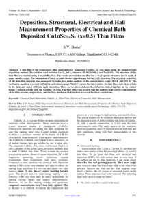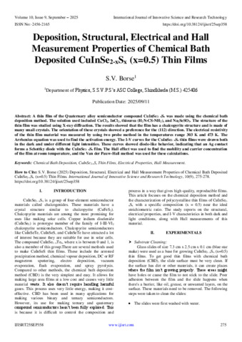 Borse, S.V. (2025) Deposition, Structural, Electrical and Hall Measurement Properties of Chemical Bath Deposited CuInSe2-xSx (x=0.5) Thin Films. International Journal of Innovative Science and Research Technology, 10 (9): 25sep358. pp. 275-278. ISSN 2456-2165