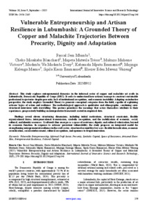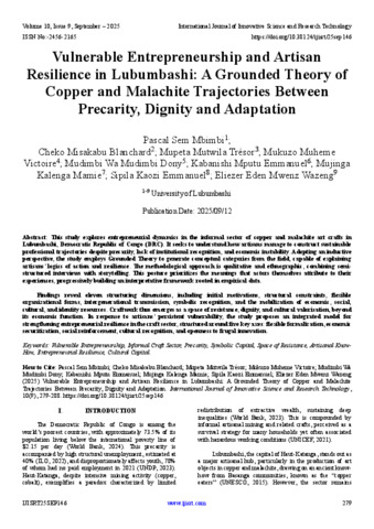 Sem Mbimbi, Pascal and Misakabu Blanchard, Cheko and Mutwila Trésor, Mupeta and Muheme Victoire, Mukuzo and Mudimbi Dony, Mudimbi Wa and Mputu Emmanuel, Kabanishi and Kalenga Mamie, Mujinga and Kaozi Emmanuel, Sipila and Mwenz Wazeng, Eliezer Eden (2025) Vulnerable Entrepreneurship and Artisan Resilience in Lubumbashi: A Grounded Theory of Copper and Malachite Trajectories Between Precarity, Dignity and Adaptation. International Journal of Innovative Science and Research Technology, 10 (9): 25sep146. pp. 279-288. ISSN 2456-2165