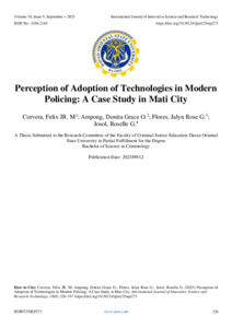JR. M, Corvera, Felix and Grace O., Ampong, Donita and Rose G., Flores, Jalyn and Roselle G., Josol, (2025) Perception of Adoption of Technologies in Modern Policing: A Case Study in Mati City. International Journal of Innovative Science and Research Technology, 10 (9): 25sep273. pp. 326-347. ISSN 2456-2165