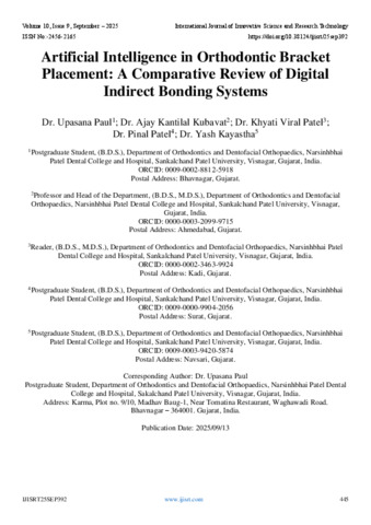 Paul, Dr. Upasana and Kubavat, Dr. Ajay Kantilal and Patel, Dr. Khyati Viral and Patel, Dr. Pinal and Kayastha, Dr. Yash (2025) Artificial Intelligence in Orthodontic Bracket Placement: A Comparative Review of Digital Indirect Bonding Systems. International Journal of Innovative Science and Research Technology, 10 (9): 25sep392. pp. 445-452. ISSN 2456-2165