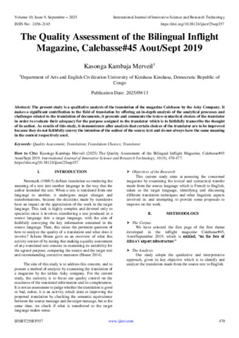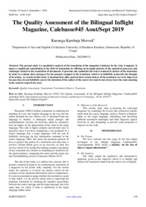 Kambaja Merveil, Kasonga (2025) The Quality Assessment of the Bilingual Inflight Magazine, Calebasse#45 Aout/Sept 2019. International Journal of Innovative Science and Research Technology, 10 (9): 25sep357. pp. 470-477. ISSN 2456-2165