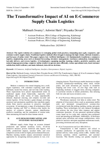 Swamy, Mallinath and Hatti, Ashwini and Devani, Priyanka (2025) The Transformative Impact of AI on E-Commerce Supply Chain Logistics. International Journal of Innovative Science and Research Technology, 10 (9): 25sep102. pp. 500-502. ISSN 2456-2165