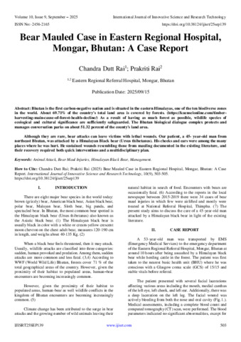 Dutt Rai, Chandra and Rai, Prakriti (2025) Bear Mauled Case in Eastern Regional Hospital, Mongar, Bhutan: A Case Report. International Journal of Innovative Science and Research Technology, 10 (9): 25sep139. pp. 503-505. ISSN 2456-2165
