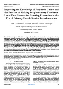Harikedua, Vera. T. and Pascoal, Meildy E. and VL Sambuaga, Joy (2025) Improving the Knowledge of Posyandu Cadres and the Practice of Making Supplementary Food from Local Food Sources for Stunting Prevention in the Era of Primary Health Service Transformation. International Journal of Innovative Science and Research Technology, 10 (9): 25sep426. pp. 519-526. ISSN 2456-2165