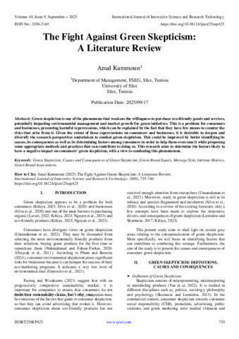 Kammoun, Amal (2025) The Fight Against Green Skepticism: A Literature Review. International Journal of Innovative Science and Research Technology, 10 (9): 25sep425. pp. 735-740. ISSN 2456-2165