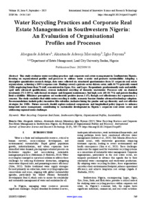 Adebare, Abegunde and Moronkeji, Akintunde Adesoji and Fayomi, Igho (2025) Water Recycling Practices and Corporate Real Estate Management in Southwestern Nigeria: An Evaluation of Organisational Profiles and Processes. International Journal of Innovative Science and Research Technology, 10 (9): 25sep692. pp. 769-779. ISSN 2456-2165