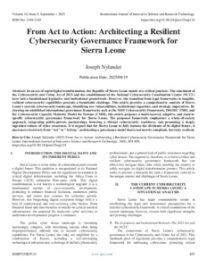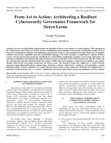 Nylander, Joseph (2025) From Act to Action: Architecting a Resilient Cybersecurity Governance Framework for Sierra Leone. International Journal of Innovative Science and Research Technology, 10 (9): 25sep124. pp. 855-858. ISSN 2456-2165