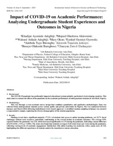 Adegbiji, Khadijat Ayomide and Akinwumi, Mojeed Olaoluwa and Adegbiji, Waheed Atilade and Okon, Mary and Oyewole, Ezekiel Oyeniyi and Ibirongbe, Adebola Tayo and Adeoye, Akorede Temilola and Bamgbose, Busayo Olakunle and Oladunjoye, Olaniyan David (2025) Impact of COVID-19 on Academic Performance: Analyzing Undergraduate Student Experiences and Outcomes in Nigeria. International Journal of Innovative Science and Research Technology, 10 (9): 25sep324. pp. 859-864. ISSN 2456-2165