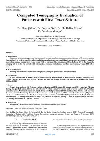 Khan, Dr.Sharoj and Sah, Dr.Dambar and Akhtar, Dr.Md Kalim and Mourya, Dr.Vandana (2025) Computed Tomography Evaluation of Patients with First Onset Seizure. International Journal of Innovative Science and Research Technology, 10 (9): 25sep243. pp. 883-888. ISSN 2456-2165