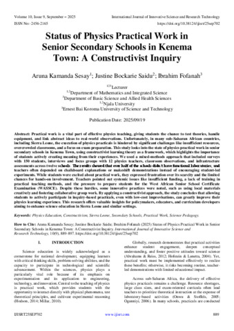 Sesay, Aruna Kamanda and Saidu, Justine Bockarie and Fofanah, Ibrahim (2025) Status of Physics Practical Work in Senior Secondary Schools in Kenema Town: A Constructivist Inquiry. International Journal of Innovative Science and Research Technology, 10 (9): 25sep702. pp. 889-897. ISSN 2456-2165