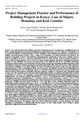 Gangla, Isaya Soga and riah, George kinoti Kingo' and Nyagwachi, Josiah Nyangaresi (2025) Project Management Practice and Performance of Building Projects in Kenya: Case of Migori, Homabay and Kisii Counties. International Journal of Innovative Science and Research Technology, 10 (9): 25sep449. pp. 1546-1554. ISSN 2456-2165