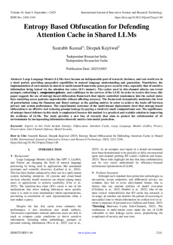 Kansal, Saurabh and Kejriwal, Deepak (2025) Entropy Based Obfuscation for Defending Attention Cache in Shared LLMs. International Journal of Innovative Science and Research Technology, 10 (9): 25sep1140. pp. 2241-2256. ISSN 2456-2165
