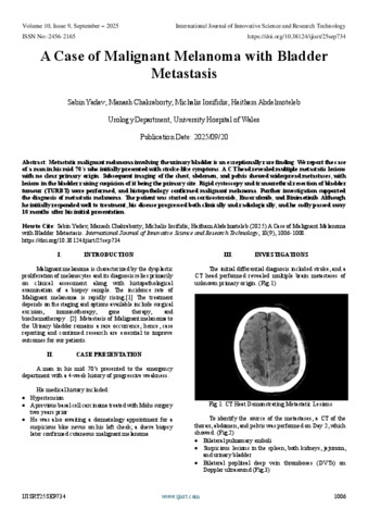 Yadav, Sabin and Chakraborty, Manash and Iosifidis, Michalis and Abdelmoteleb, Haitham (2025) A Case of Malignant Melanoma with Bladder Metastasis. International Journal of Innovative Science and Research Technology, 10 (9): 25sep734. pp. 1006-1008. ISSN 2456-2165