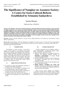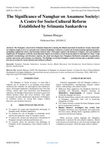 Bhargav, Santanu (2025) The Significance of Namghar on Assamese Society: A Centre for Socio-Cultural Reform Established by Srimanta Sankardeva. International Journal of Innovative Science and Research Technology, 10 (9): 25sep206. pp. 1009-1010. ISSN 2456-2165