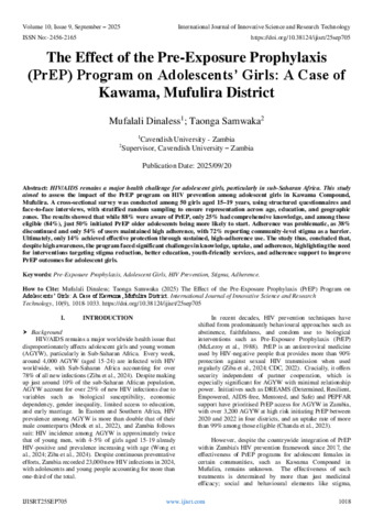 Dinaless, Mufalali and Samwaka, Taonga (2025) The Effect of the Pre-Exposure Prophylaxis (PrEP) Program on Adolescents’ Girls: A Case of Kawama, Mufulira District. International Journal of Innovative Science and Research Technology, 10 (9): 25sep705. pp. 1018-1033. ISSN 2456-2165