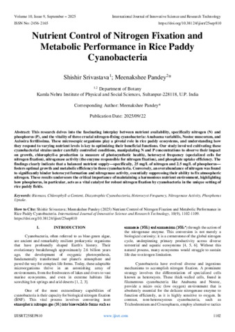 Srivastava, Shishir and Pandey, Meenakshee (2025) Nutrient Control of Nitrogen Fixation and Metabolic Performance in Rice Paddy Cyanobacteria. International Journal of Innovative Science and Research Technology, 10 (9): 25sep810. pp. 1102-1109. ISSN 2456-2165
