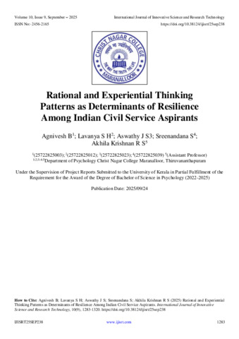 B, Agnivesh and S H, Lavanya and J S, Aswathy and S, Sreenandana and R S, Akhila Krishnan (2025) Rational and Experiential Thinking Patterns as Determinants of Resilience Among Indian Civil Service Aspirants. International Journal of Innovative Science and Research Technology, 10 (9): 25sep238. pp. 1283-1320. ISSN 2456-2165