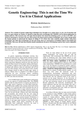 Iakubzhanova, Khilola (2025) Genetic Engineering: This is not the Time We Use it in Clinical Applications. International Journal of Innovative Science and Research Technology, 10 (8): 25aug1333. pp. 3061-3064. ISSN 2456-2165