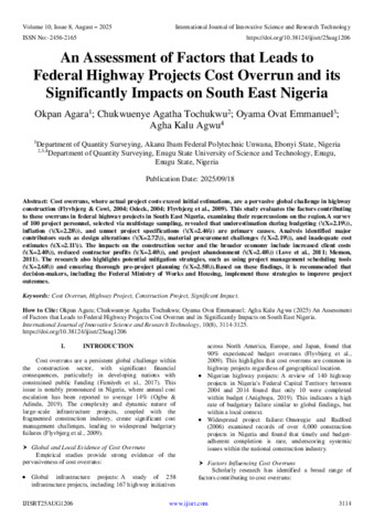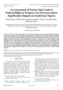 Agara, Okpan and Tochukwu, Chukwuenye Agatha and Emmanuel, Oyama Ovat and Agwu, Agha Kalu (2025) An Assessment of Factors that Leads to Federal Highway Projects Cost Overrun and its Significantly Impacts on South East Nigeria. International Journal of Innovative Science and Research Technology, 10 (8): 25aug1206. pp. 3114-3125. ISSN 2456-2165