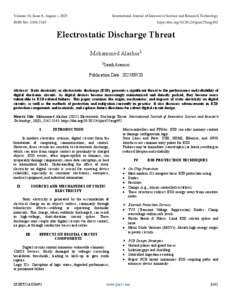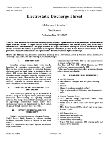 Alashur, Mohammed (2025) Electrostatic Discharge Threat. International Journal of Innovative Science and Research Technology, 10 (8): 25aug492. pp. 3142-3143. ISSN 2456-2165