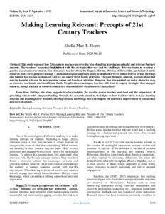 Flores, Shella Mae T. (2025) Making Learning Relevant: Precepts of 21st Century Teachers. International Journal of Innovative Science and Research Technology, 10 (9): 25sep847. pp. 1436-1439. ISSN 2456-2165
