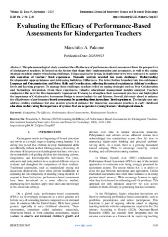 Palcone, Maochilin A. (2025) Evaluating the Efficacy of Performance-Based Assessments for Kindergarten Teachers. International Journal of Innovative Science and Research Technology, 10 (9): 25sep887. pp. 1454-1456. ISSN 2456-2165