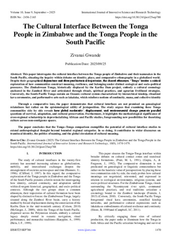 Gwande, Zivanai (2025) The Cultural Interface Between the Tonga People in Zimbabwe and the Tonga People in the South Pacific. International Journal of Innovative Science and Research Technology, 10 (9): 25sep788. pp. 1470-1479. ISSN 2456-2165