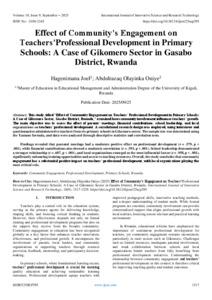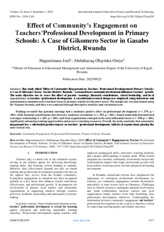 Joel, Hagenimana and Oniye, Abdulrazaq Olayinka (2025) Effect of Community’s Engagement on Teachers’Professional Development in Primary Schools: A Case of Gikomero Sector in Gasabo District, Rwanda. International Journal of Innovative Science and Research Technology, 10 (9): 25sep295. pp. 1517-1529. ISSN 2456-2165