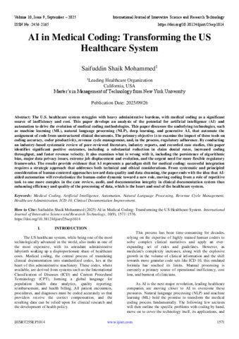 Mohammed, Saifuddin Shaik (2025) AI in Medical Coding: Transforming the US Healthcare System. International Journal of Innovative Science and Research Technology, 10 (9): 25sep1014. pp. 1571-1576. ISSN 2456-2165