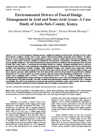 Muthuri, Julius Kirimi and Kirimi, Lilian Mukiri and Mburugu, Kirema Nkanata and Kipngeno, Aaron (2025) Environmental Drivers of Faecal Sludge Management in Arid and Semi-Arid Areas: A Case Study of Isiolo Sub-County, Kenya. International Journal of Innovative Science and Research Technology, 10 (9): 25sep008. pp. 2031-2038. ISSN 2456-2165