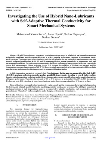 Surve, Mohammed Yasser and Upreti, Aarav and Nagarajan, Shrikar and Dsouza, Nathan (2025) Investigating the Use of Hybrid Nano-Lubricants with Self-Adaptive Thermal Conductivity for Smart Mechanical Systems. International Journal of Innovative Science and Research Technology, 10 (9): 25sep1501. pp. 2652-2662. ISSN 2456-2165