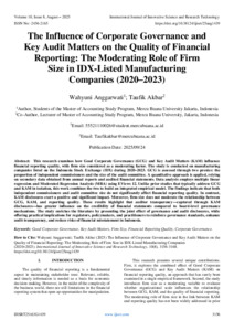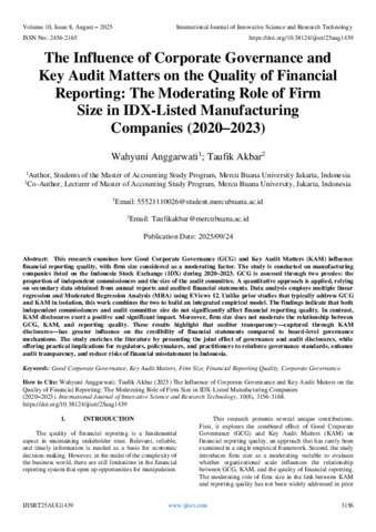 Anggarwati, Wahyuni and Akbar, Taufik (2025) The Influence of Corporate Governance and Key Audit Matters on the Quality of Financial Reporting: The Moderating Role of Firm Size in IDX-Listed Manufacturing Companies (2020–2023). International Journal of Innovative Science and Research Technology, 10 (9): 25aug1439. pp. 3156-3168. ISSN 2456-2165