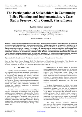 Bangura, Kabba Haroun (2025) The Participation of Stakeholders in Community Policy Planning and Implementation. A Case Study: Freetown City Council, Sierra Leone. International Journal of Innovative Science and Research Technology, 10 (9): 25sep974. pp. 1708-1716. ISSN 2456-2165