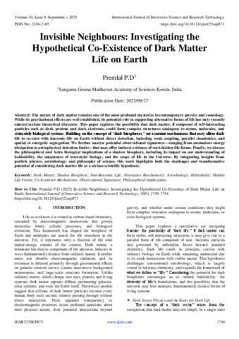 P.D, Premlal (2025) Invisible Neighbours: Investigating the Hypothetical Co-Existence of Dark Matter Life on Earth. International Journal of Innovative Science and Research Technology, 10 (9): 25sep873. pp. 1749-1754. ISSN 2456-2165
