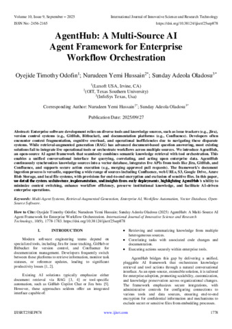 Odofin, Oyejide Timothy and Hussain, Nurudeen Yemi and Oladosu, Sunday Adeola (2025) AgentHub: A Multi-Source AI Agent Framework for Enterprise Workflow Orchestration. International Journal of Innovative Science and Research Technology, 10 (9): 25sep878. pp. 1778-1783. ISSN 2456-2165
